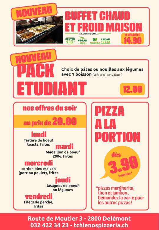 Nous sommes ouverts 7 jours sur 7, de 11h à 22h non-stop. Buffet pizza le midi, carte complète le soir. Commandes à emporter disponibles au 077 943 14 80.